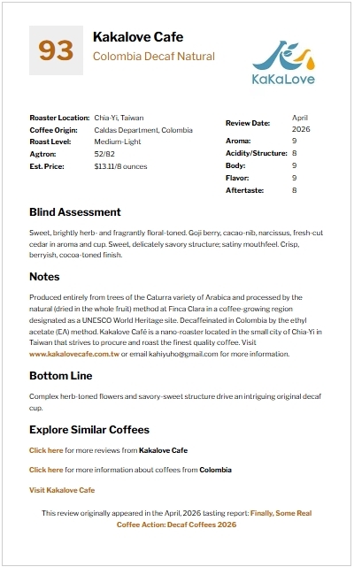The bottom line: Complex herb-toned flowers and savory-sweet structure drive an intriguing original decaf cup.