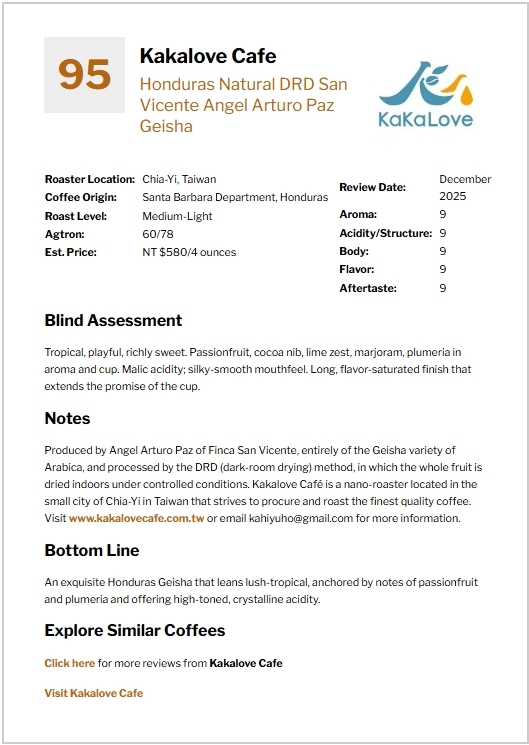 Blind assessment: Tropical, playful, richly sweet. Passionfruit, cocoa nib, lime zest, marjoram, plumeria in aroma and cup. Malic acidity; silky-smooth mouthfeel. Long, flavor-saturated finish that extends the promise of the cup.