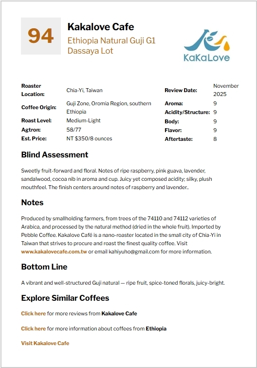 The bottom line: A vibrant and well-structured Guji natural — ripe fruit, spice-toned florals, juicy-bright.