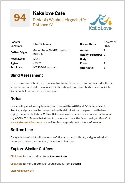 The bottom line: A Yirgacheffe of quiet refinement — soft florals, citrus backbone, and gentle herbal sweetness layered over a sweet, transparent structure.