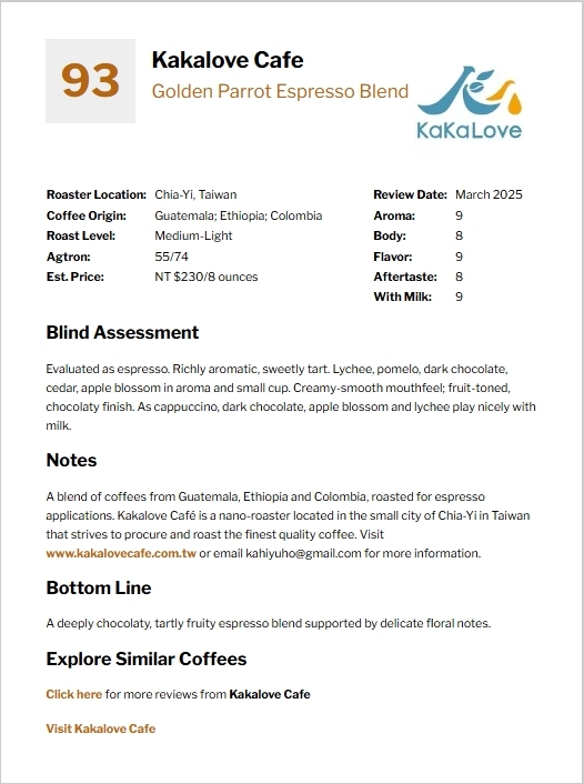 Creamy-smooth mouthfeel; fruit-toned, chocolaty finish. As cappuccino, dark chocolate, apple blossom and lychee play nicely with milk.